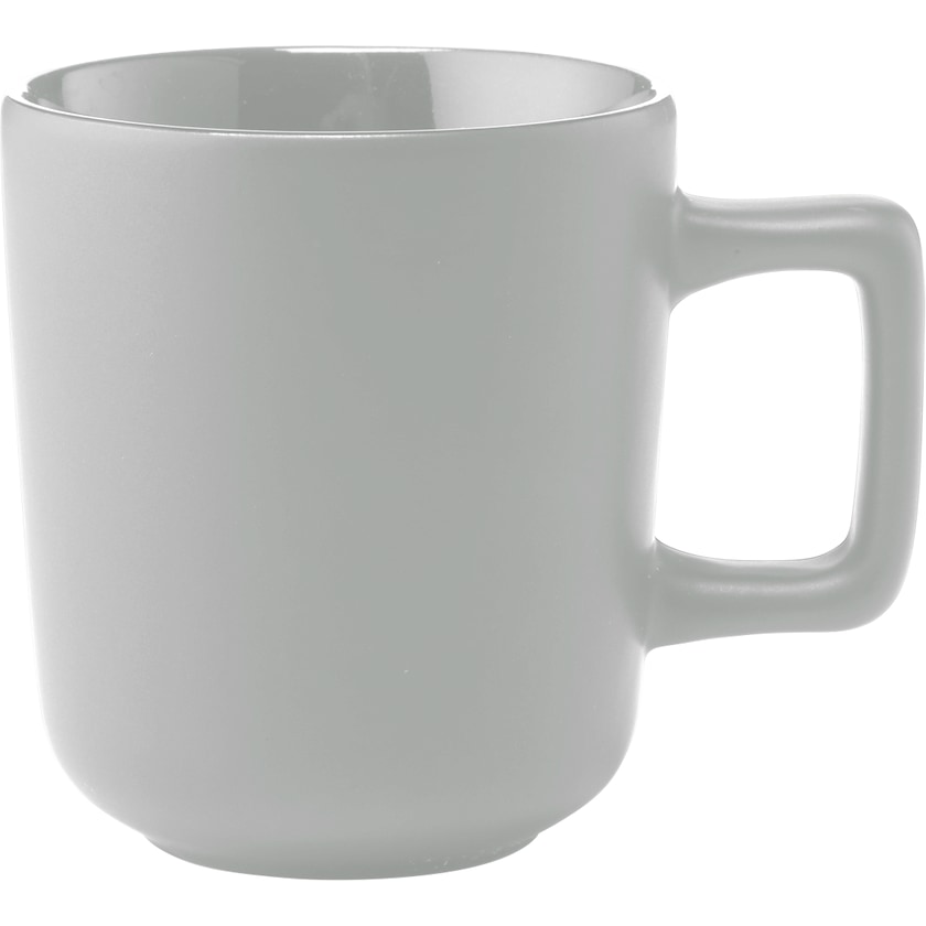 Charakteristischer Becher mit effektvollem Henkel. Die Außenseite ist matt und die Innenseite glänzend. Die Tasse und der Druck sind spülmaschinenfest. Der Druck ist nach EN 12875-2 zertifiziert.