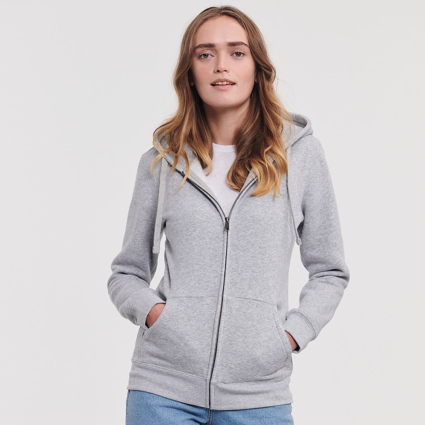 Kapuzenjacke mit Reißverschluss mit moderner Passform. Die Passform ist körpernah mit weniger Stoff an Achseln und Ärmeln. Geliefert wird einzeln verpackt in Plastiktüten. Gibt es auch als Herrenmodell.