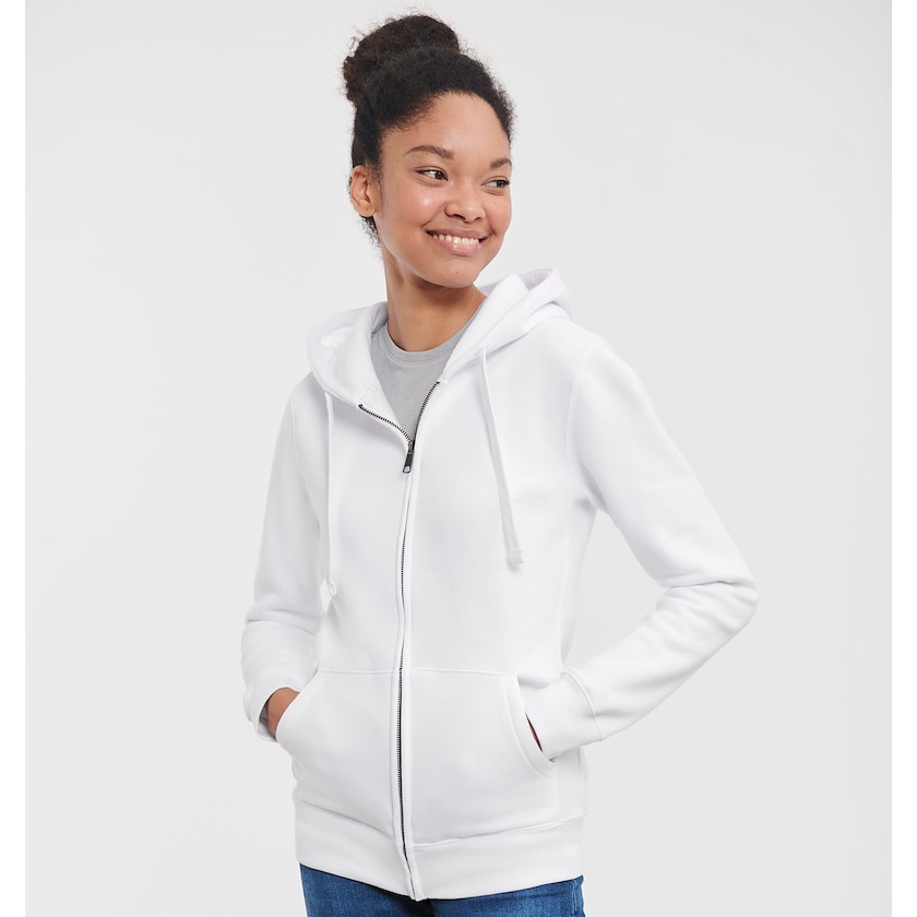 Kapuzenjacke mit Reißverschluss mit moderner Passform. Die Passform ist körpernah mit weniger Stoff an Achseln und Ärmeln. Geliefert wird einzeln verpackt in Plastiktüten. Gibt es auch als Herrenmodell.