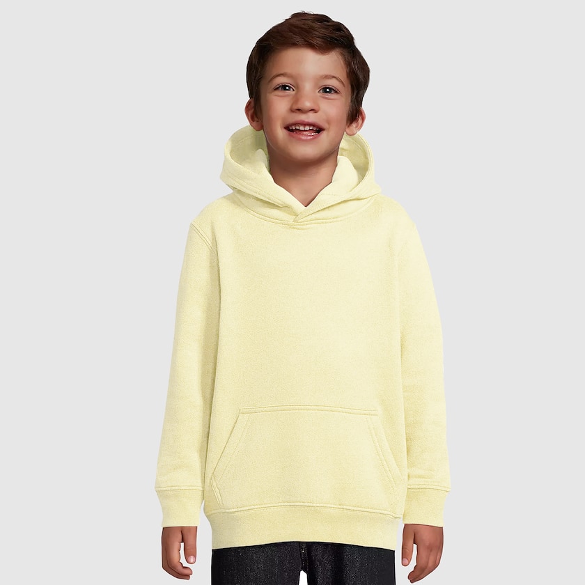 Preisgünstiger Hoodie für Kinder. Der Hoodie hat keine Kordeln am Hals, um eine Strangulierungsgefahr zu vermeiden. Hergestellt aus 80 % Baumwolle und 20 % recyceltem Polyester.