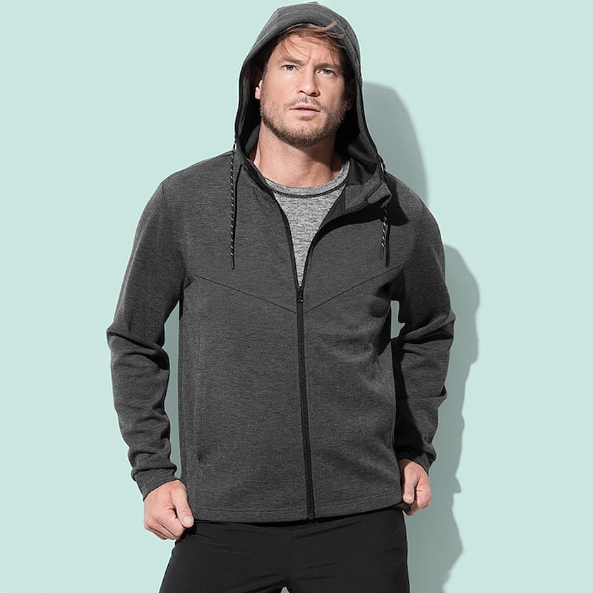 Umweltfreundliche Kapuzenjacke mit Reißverschluss. Die Jacke hat ein modernes Design und eignet sich für die Freizeit und beim Sport. Die Farbe Black Opal ist aus 70 % Polyester, 24 % recyceltem Polyester und 6 % Elastan. Die Farbe Anthra Heather ist aus 53 % Polyester, 28 % recyceltem Polyester, 13 % Viskose und 6 % Elastan. Gibt es auch als Damenmodell.