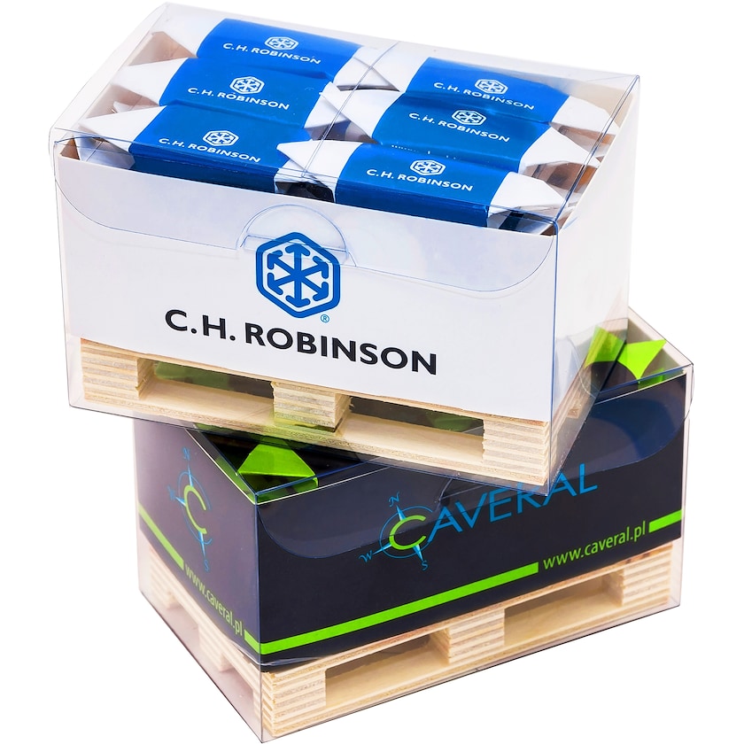 Lustiges Set mit 24 Fudges auf einer Mini-EUR-Palette. Der Fudge wird nach einem traditionellen Rezept hergestellt und hat einen wunderbaren Geschmack. Die Kartonverpackungen von Fudge werden mit 4-Farben-Fotodruck bedruckt, ebenso wie das Kartonbanner, das um die EUR-Palette herumgeführt wird