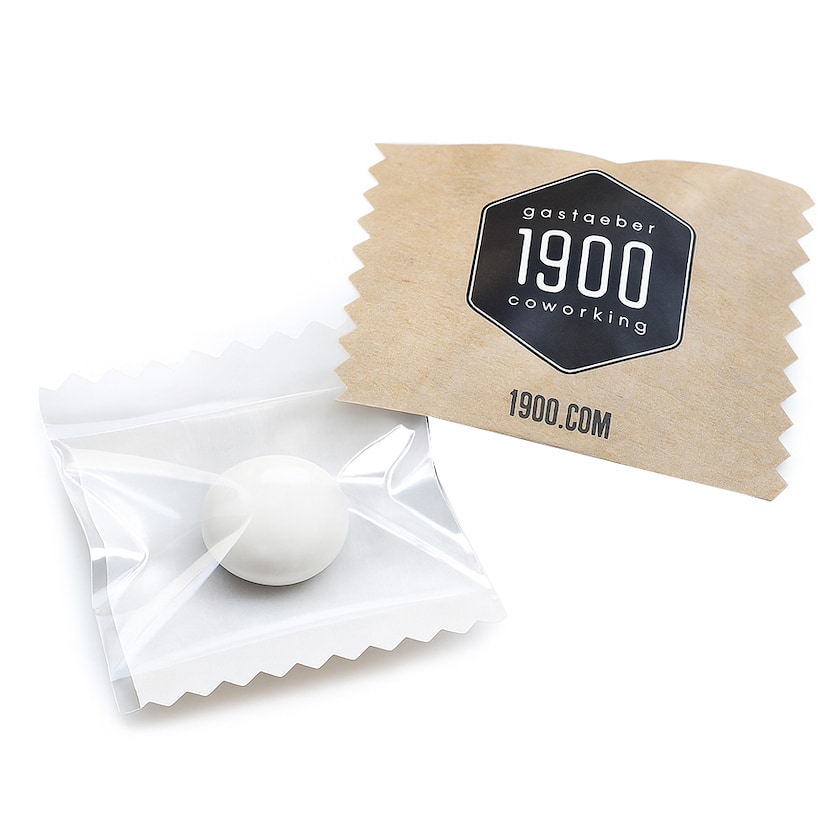 Kaugummi von Mentos im schönen Flowpack. Wählen Sie zwischen Minz- und Fruchtgeschmack. Die Oberseite der Verpackung wird nach Ihren Wünschen 4-farbig bedruckt. Die Rückseite ist transparent.