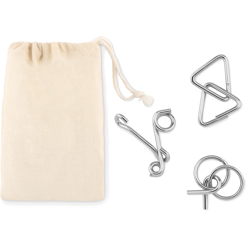 Schönes Set mit drei Knobelspielen, die das Gehirn trainieren. Die Lieferung erfolgt in einem naturfarbenen Baumwollbeutel. Der Druck erfolgt auf dem Baumwollbeutel.