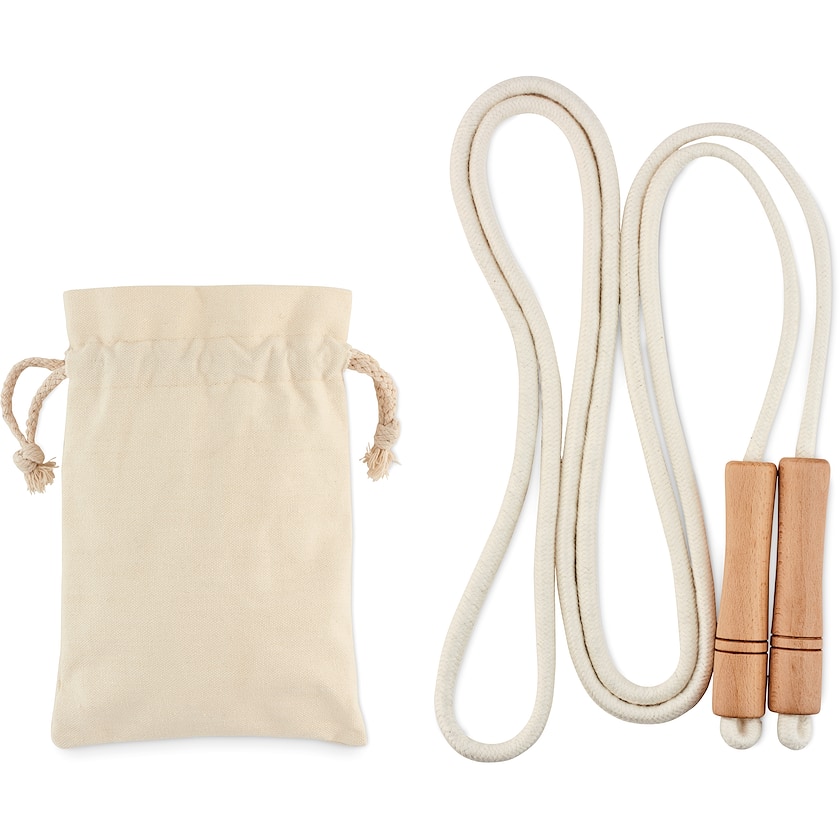 Springseil aus Baumwolle mit Holzgriffen. Das Springseil wird in einem naturfarbenen Baumwollbeutel geliefert. Der Druck wird auf dem Baumwollbeutel platziert. Die Lasergravur erfolgt an einem der Griffe.