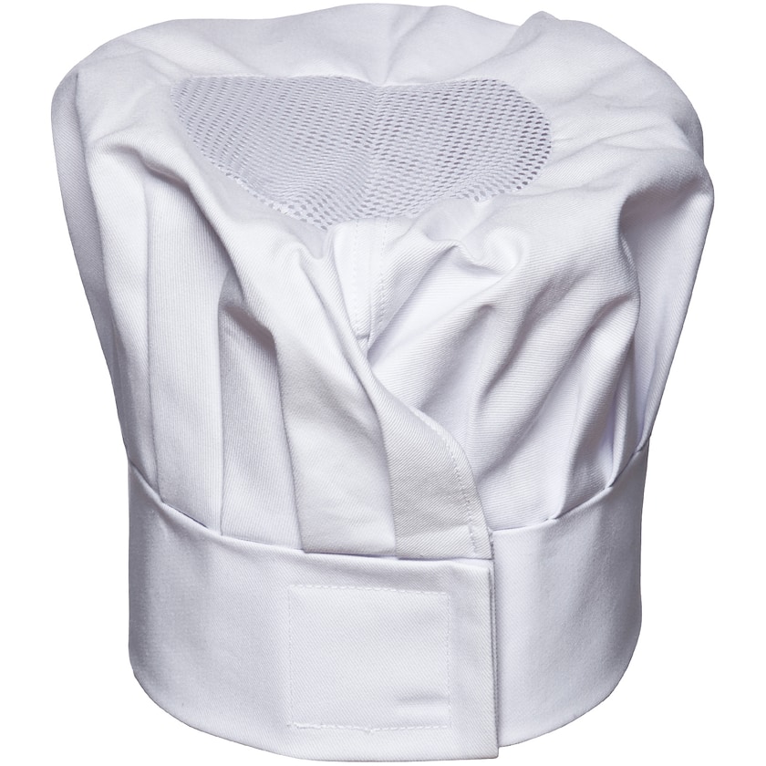 Klassische Kochmütze. Die Weite wird mit einem Klettband eingestellt. Die Kochmütze ist aus Baumwolle, nur das Netz ist aus Polyester.