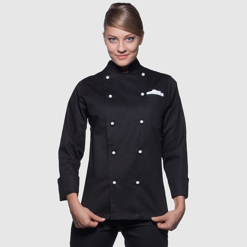 Kochjacke für Damen. Jacke mit körpernaher Passform und mit 10 losen Knöpfen (im Lieferumfang enthalten). Auf der linken Brust befindet sich eine Brusttasche. Die Kochjacke verträgt Industriewäsche bis zu 95 °C. Auch als Herrenmodell erhältlich. Gibt es auch als Herrenmodell.