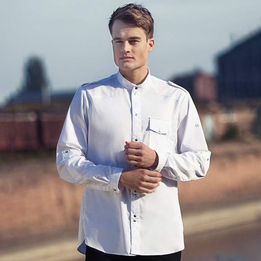 Modernes Kochhemd aus hochwertigem Stoff. Aus pflegeleichtem Stoff. Das Hemd schließt mit 5 Druckknöpfen. Verträgt Industriewäsche bis zu 95 °C.