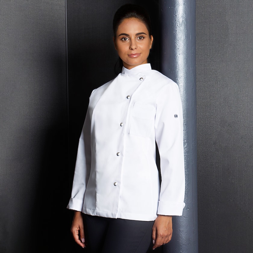 Hochwertige Kochjacke für Damen aus pflegeleichtem Stoff. Jacke mit körpernaher Passform und mit 5 Druckknöpfen. Die Kochjacke verträgt Industriewäsche bis zu 95 °C. Auch als Herrenmodell erhältlich.