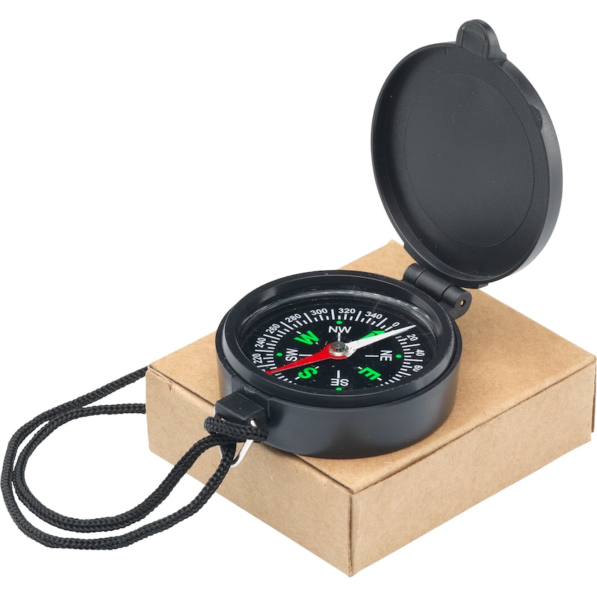 Kompass mit Umhängekordel. Dank des Umhängebandes ist es einfach, den Kompass bei Touren in der Natur immer griffbereit zu haben. Lieferung im naturfarbenen Karton.
