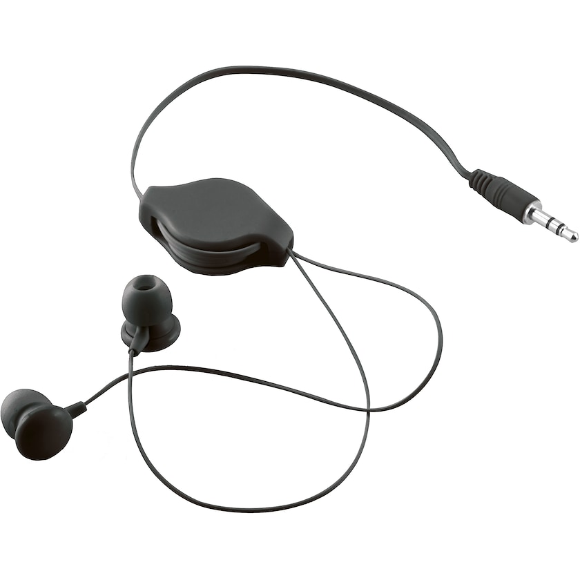 Ausziehbare in-ear-Kopfhörer. Die Kopfhörer werden in einer schwarzen non-woven-Hülle geliefert.