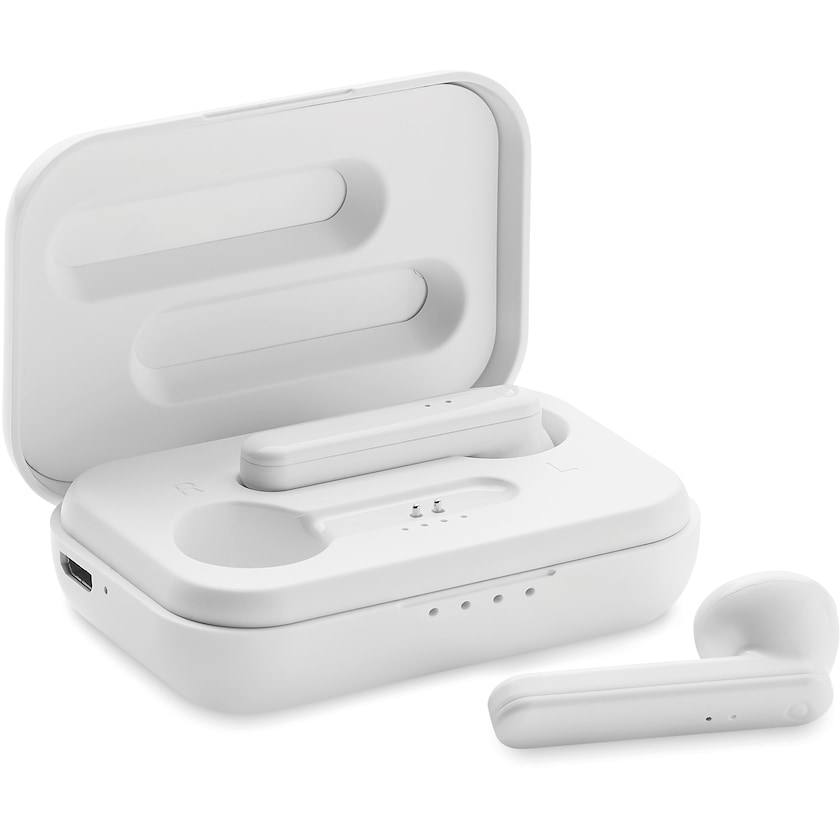 Kabellose Kopfhörer inklusive smarter Ladestation. Ein Mikro-USB-Kabel geht in den Kauf mit ein. Die Betriebszeit beläuft sich auf 3 Stunden.