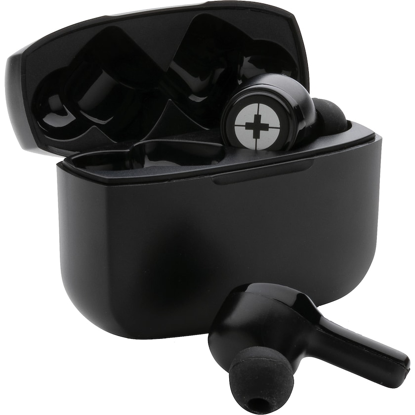 Erstklassiger Kopfhörer von Swiss Peak. In-ear-Kopfhörer und Ladebox bestehen aus recyceltem ABS. Die BT 5.3-Technologie sorgt für eine automatische Kopplung und eine stabile Verbindung. Die Spielzeit beträgt 3,5 Stunden und die Reichweite 10 Meter.