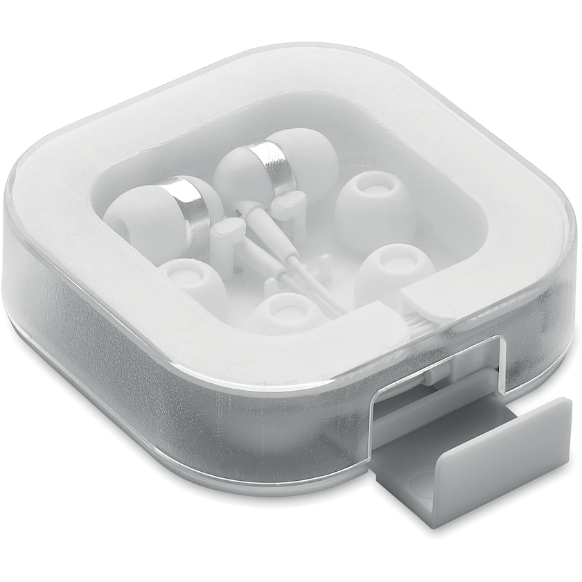 Kopfhörer mit Etui mit Mobiltelefonhalterung. Das Kabel ist 120 cm lang. Zusätzliche Silikonabdeckungen in drei verschiedenen Größen sind im Lieferumfang enthalten.