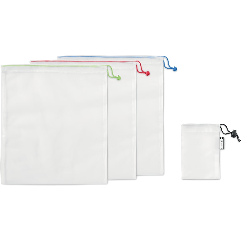 Umweltfreundliches Set bestehend aus 3 Obst-Gemüsebeuteln und einem Aufbewarungsbeutel. Eine gute Alternative zu Plastiktüten. Alle Beutel sind aus rPET, sprich aus recycelten PET-Flachen und lebensmittelecht. Der Druck efolgt auf dem kleinsten Beutel. Die Beutel können in der Waschmaschine gewaschen werden. Eine perfekte Wahl für alle, die umweltfreundliche Obstbeutel mit Logo suchen.