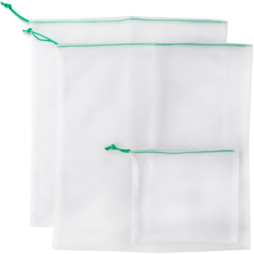 Fruchtbeutel-Set. Das Set besteht aus zwei größeren und einem kleineren Beutel. Die Beutel werden aus recyceltem Polyester gefertigt. Der kleinere Beutel kann auch als Aufbewahrungshülle für die größeren Beutel verwendet werden. Der Druck erfolgt auf dem kleineren Beutel.