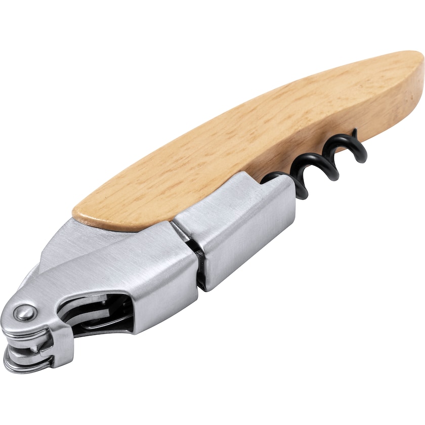 Weinöffner aus rostfreiem Stahl und hellem Holz. Die Kennzeichnung kann entweder lasergraviert oder in maximal zwei Farben gedruckt werden.