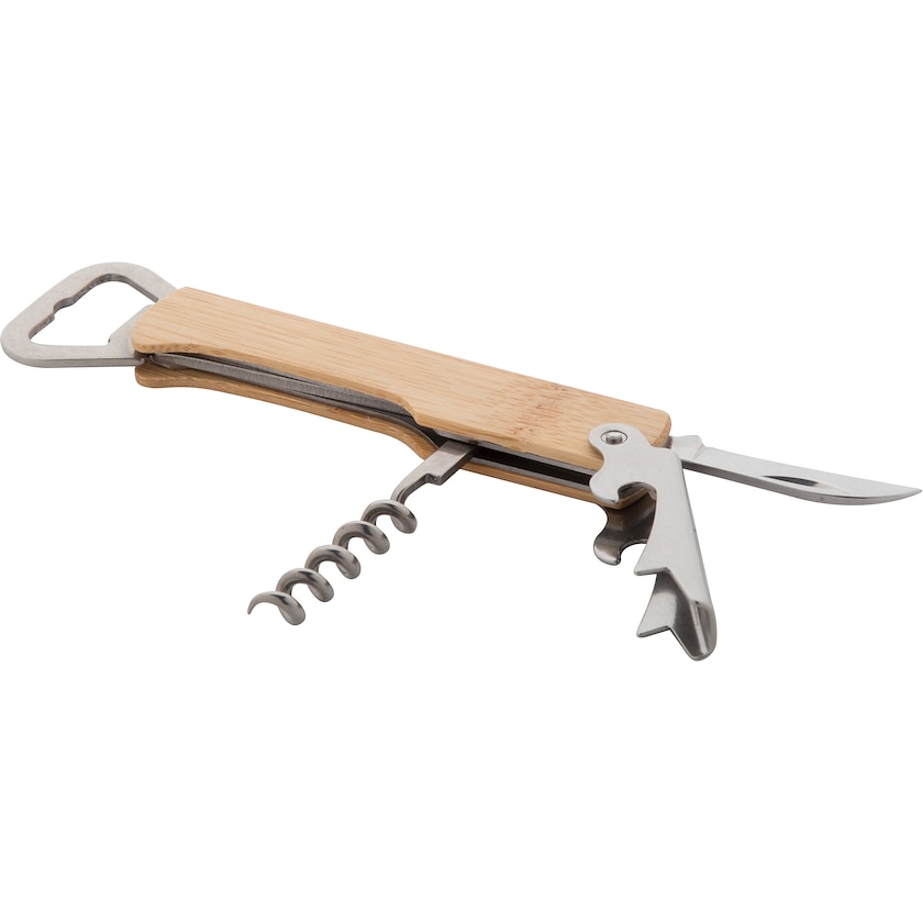 Weinöffner aus Edelstahl und Bambus. Enthält Korkenzieher, Messer und zwei Arten von Flaschenöffnern. Wird in einem braunen Geschenkkarton geliefert.