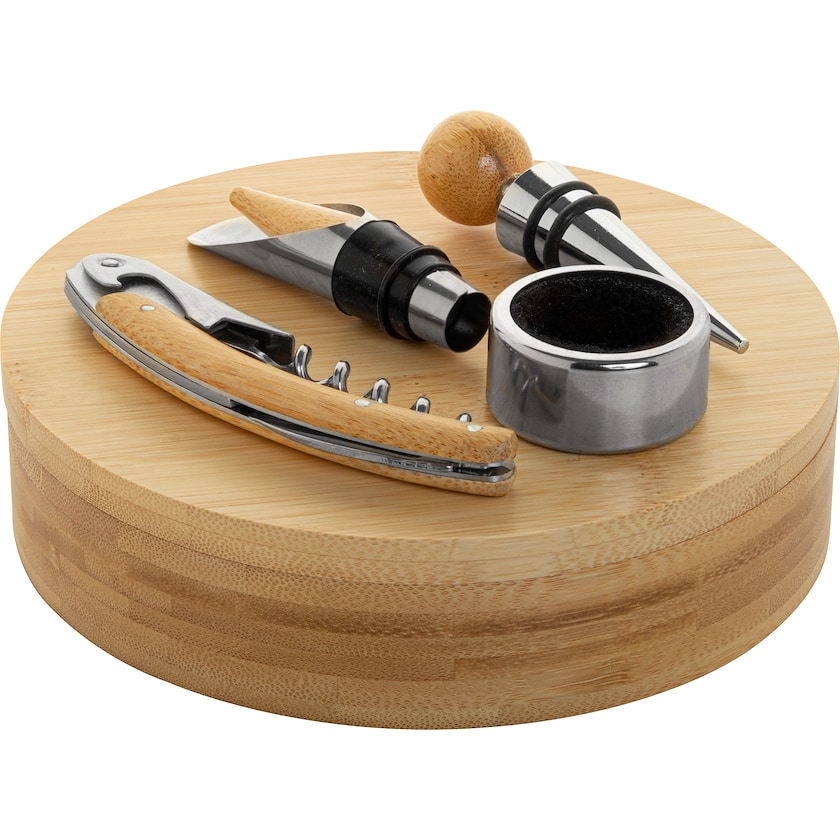 Weinset mit vier Weinaccessoires in runder Bambusbox. Die vier Weinaccessoires bestehen aus Bambus und Edelstahl. Ein ausgezeichnetes Geschenk für Weinliebhaber.