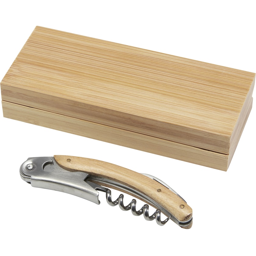 Korkenzieher aus Edelstahl und Bambus. Geliefert in einer Aufbewahrungsbox, die ebenfalls aus Bambus besteht. Der Bambus wird biologisch produziert. Die Lasergravur erfolgt auf der Aufbewahrungsbox.