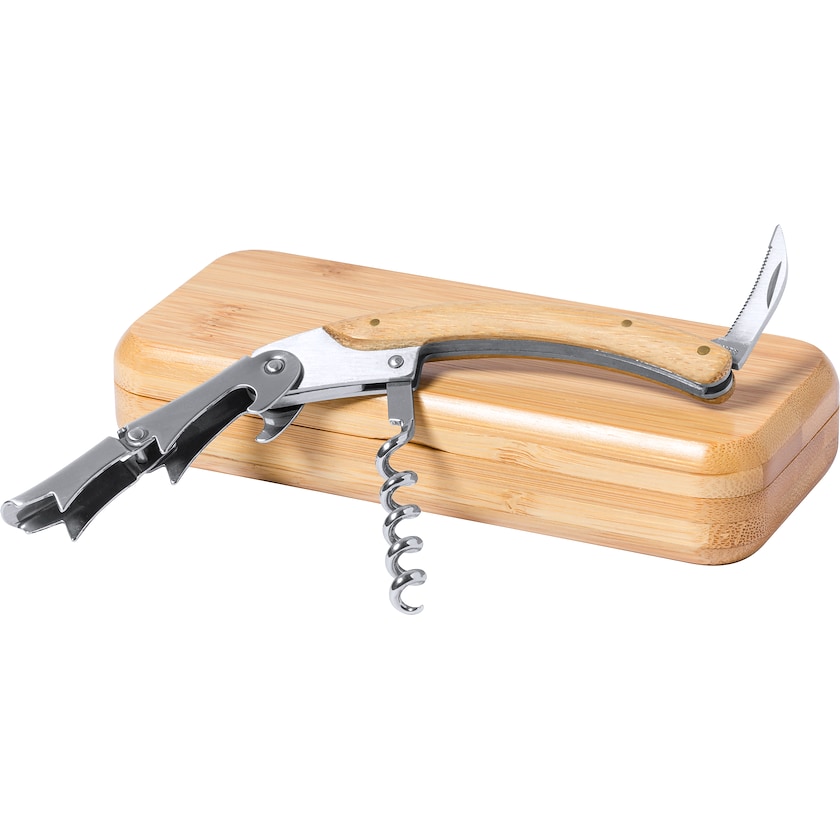 Weinflaschenöffner aus Edelstahl und Bambus. Der Flaschenöffner wird in einer stilvollen Aufbewahrungsbox aus Bambus geliefert. Ein perfektes Geschenk für alle Weinliebhaber.