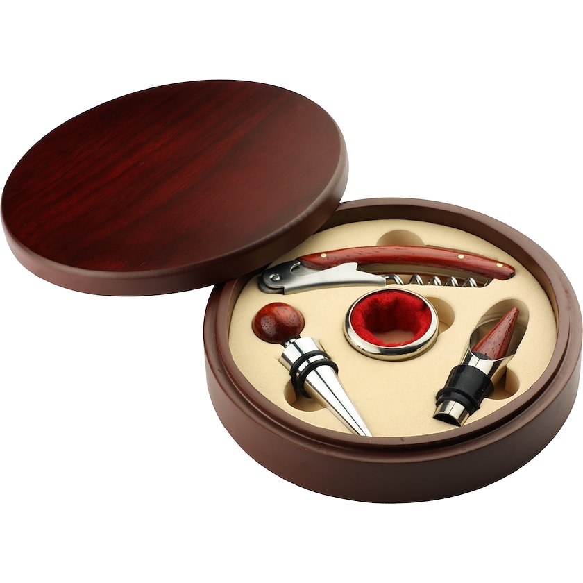 Schönes Weinset in einer runden Holzkiste. Das Set enthält das Wichtigste für den Weinkenner. Die Lasergravur kann entweder direkt auf der Holzkiste erfolgen oder auf einer Metallplatte, die an der Holzkiste befestigt wird.