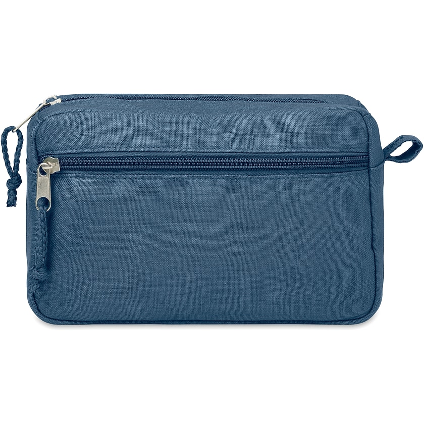 Strapazierfähiges und umweltfreundliches Reisenecessaire aus Hanf. An seiner Vorderseite befindet sich eine kleine Tasche. Hanf ist dreimal stärker als Baumwolle und erinnert ein wenig an Leinen. Das Material benötigt weder Kunstdünger noch Schädlingsbekämpfungsmittel. Das Gewächs nimmt außerdem mehr Kohlendioxid auf, als bei der Produktion entsteht.