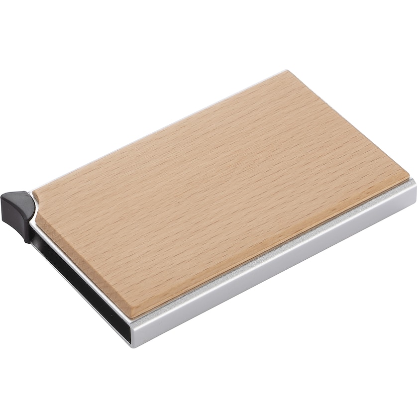 Kreditkartenetui mit RFID-Schutz. Hermione besteht aus Aluminium und Holz und bietet Platz für 6 Kreditkarten. Die Lieferung erfolgt einzeln verpackt in einem braunen Pappkarton.