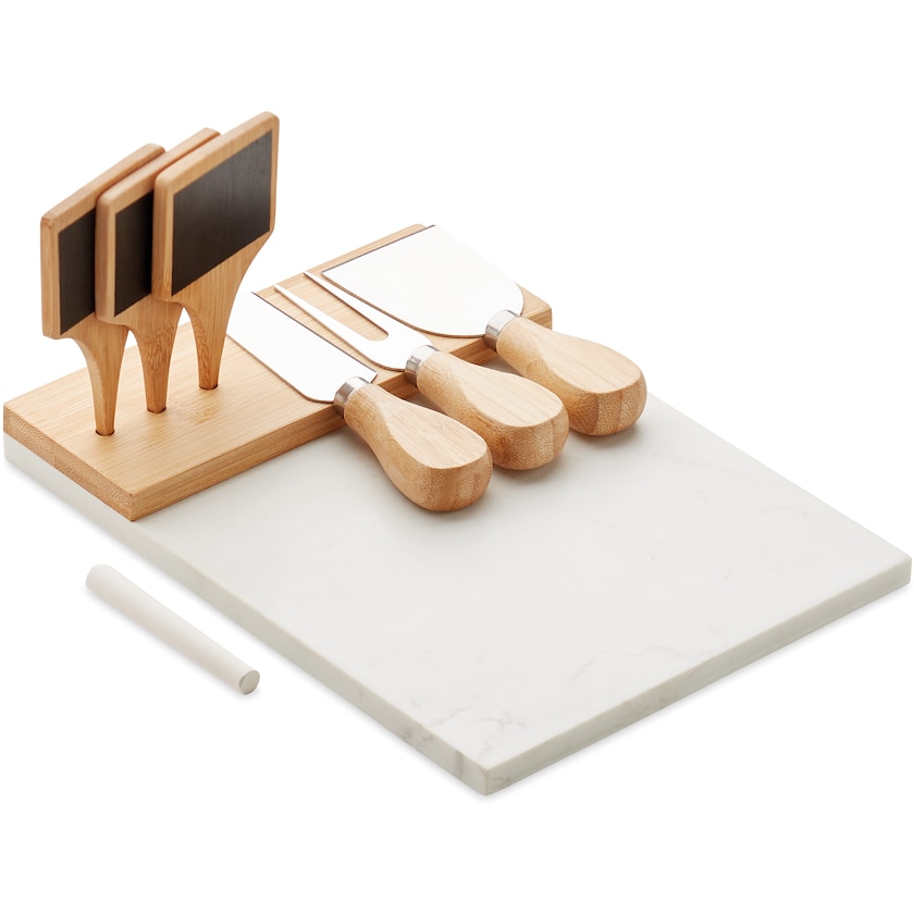 Käseplatte aus Marmor und Bambus mit dazugehörigen Käsemessern und Beschriftungstafeln. Ein luxuriöses Geschenk für alle Käseliebhaber. Mit den Täfelchen können Sie die verschiedenen Käsesorten oder Snacks einfach kennzeichnen. 1 Kreide enthalten. Geliefert in einer Geschenkbox. Die Lasergravur erfolgt auf der Bambuspanel.