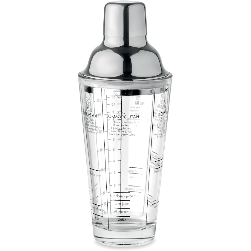 Glas-Cocktailshaker mit Edelstahldeckel. Cocktailrezepte und Maßangaben sind auf dem Glas aufgedruckt. Ein perfektes Geschenk für jeden, der gute Drinks liebt.