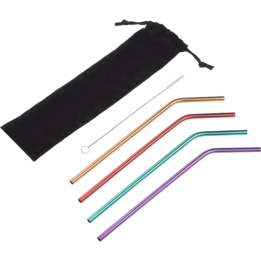 Set mit vier Trinkhalm aus rostfreiem Edelstahl. Jeder Trinkhalm misst Ø 6 x 220 mm. Die Lieferung erfolgt in einem praktischen Aufbewahrungsbeutel. Der Druck erfolgt auf dem Beutel. Mit Reinigungsbürste.
