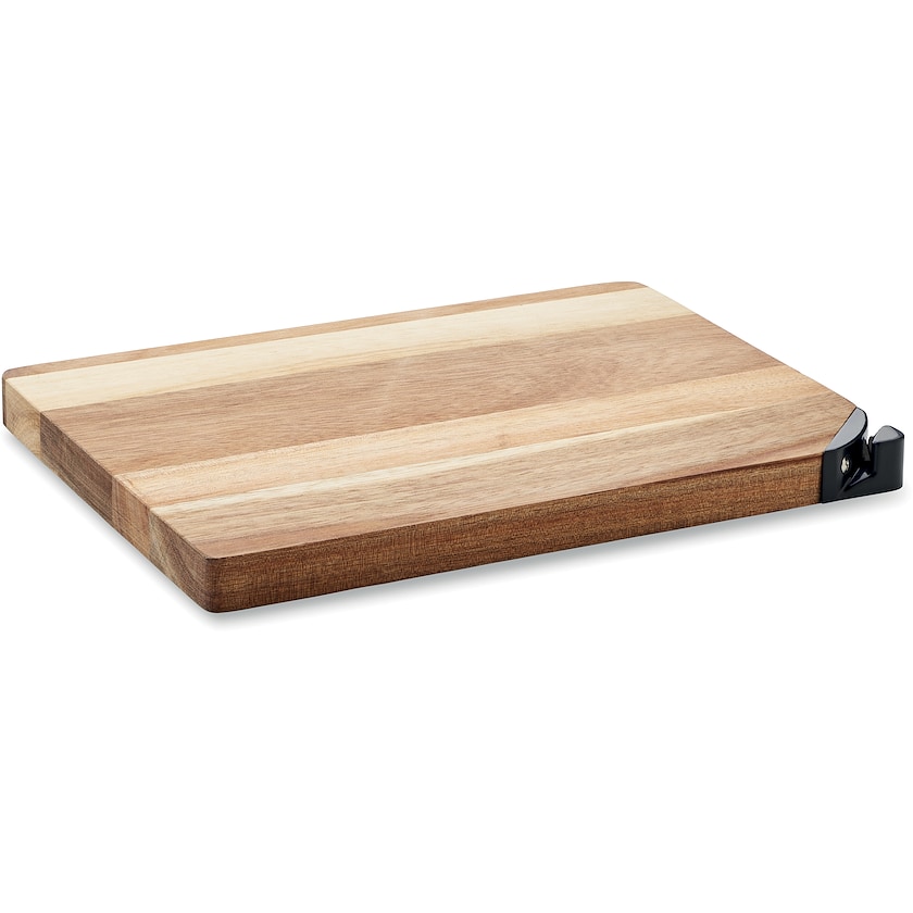 Ein aufwändiges Schneidebrett aus Akazienholz. In einer Ecke befindet sich ein praktischer Messerschärfer. Ein perfektes Geschenk für Kochbegeisterte.