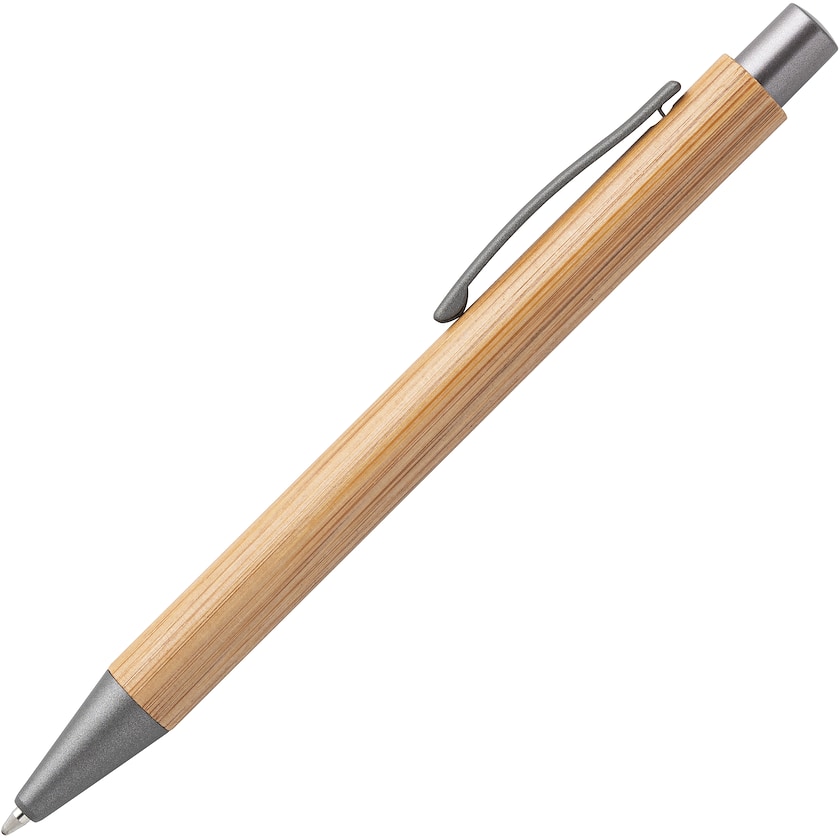 Eleganter Stift aus Bambus und Metall. Der Stift kann wahlweise bedruckt oder mit Lasergravur beschriftet werden. Die Tintenpatrone enthält blaue Tinte.