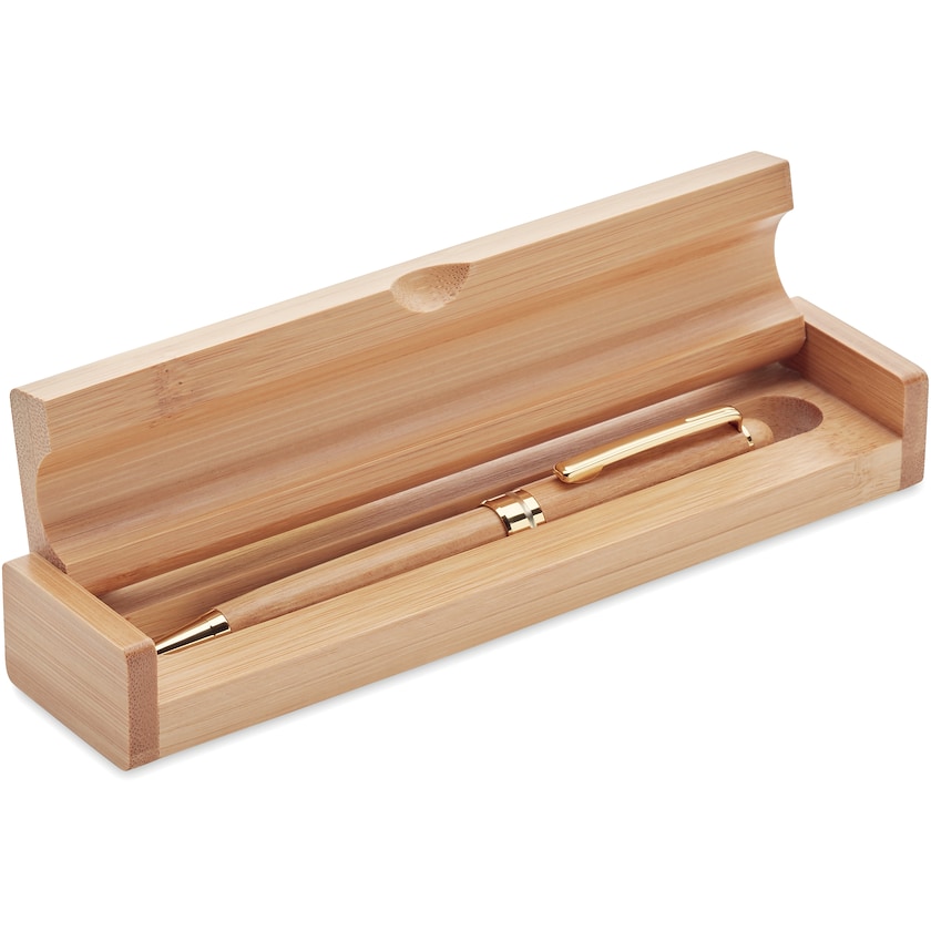 Luxuriöser Kugelschreiber aus goldverchromtem Metall und Bambus. Der Stift wird in einer luxuriösen Geschenkbox geliefert, die ebenfalls aus Bambus besteht. Der Druck kann entweder auf dem Stift selbst oder auf der Geschenkbox platziert werden.