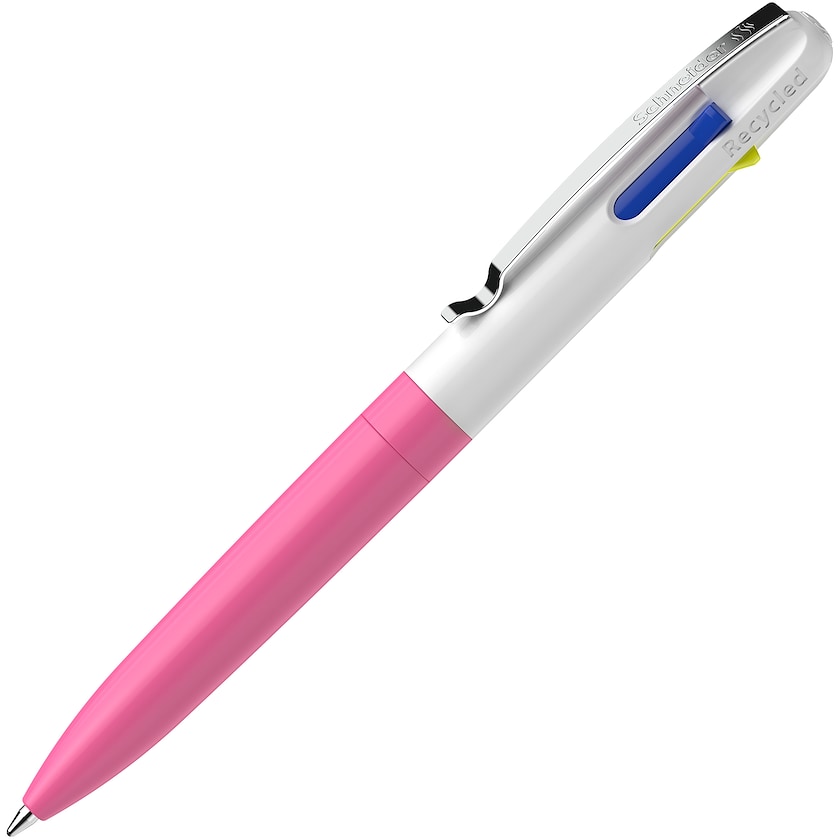 Neonfarbener Stift mit vier verschiedenen Tintenfarben. Der Stift verfügt über eine schwarze, blaue, rote und grüne Tinte. Die Farbänderung erfolgt per Knopfdruck. Der Stiftkörper besteht aus recyceltem Kunststoff und wird klimaneutral hergestellt.
