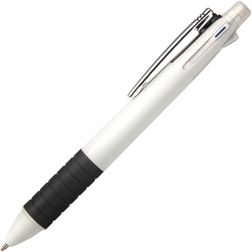 Multifunktionaler Stift mit vier verschiedenen Tintenfarben und Bleistift. Die Tintenfarben sind blau, schwarz, rot und grün. Die Mine ist 0,5 mm dick. Der Druckbleistift kann bei Bedarf nachgefüllt werden. An der Spitze befindet sich ein Radiergummi.