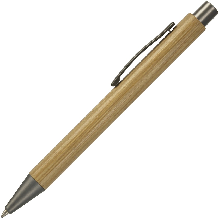Kugelschreiber aus Bambus mit Clip aus Metall. Die Details sind mit einer dunkelgrauen Metallic-Farbe lackiert. Der Stift ist eine gute Wahl für die Umwelt, da Bambus ein umweltfreundliches Material ist, das klimaeffizient angebaut wird.