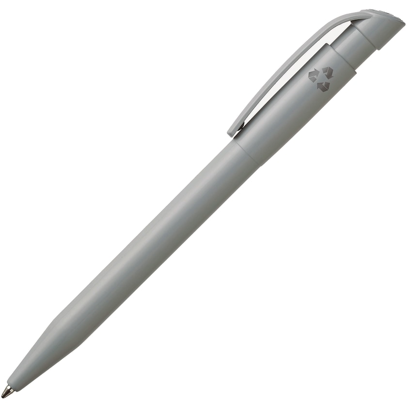 Kugelschreiber mit Aufdruck aus 100% recyceltem ABS-Kunststoff. Die Kunststoffqualität ist äußerst hoch, obwohl das Plastik recycelt wurde. Auf dem Stift befindet sich ein vorgedrucktes Recycling-Symbol.