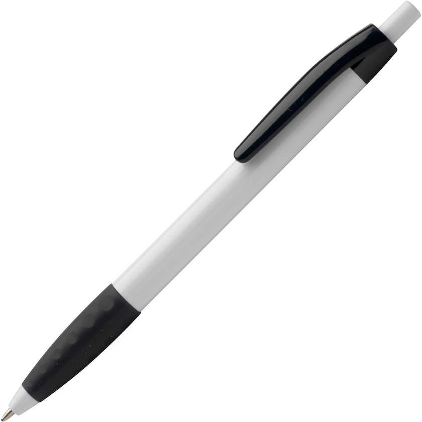 Weißer Kugelschreiber mit angenehmen Gummigriff. Stift mit Clip und Grifffläche in Kontrastfarbe. In vielen Farben erhältlich.