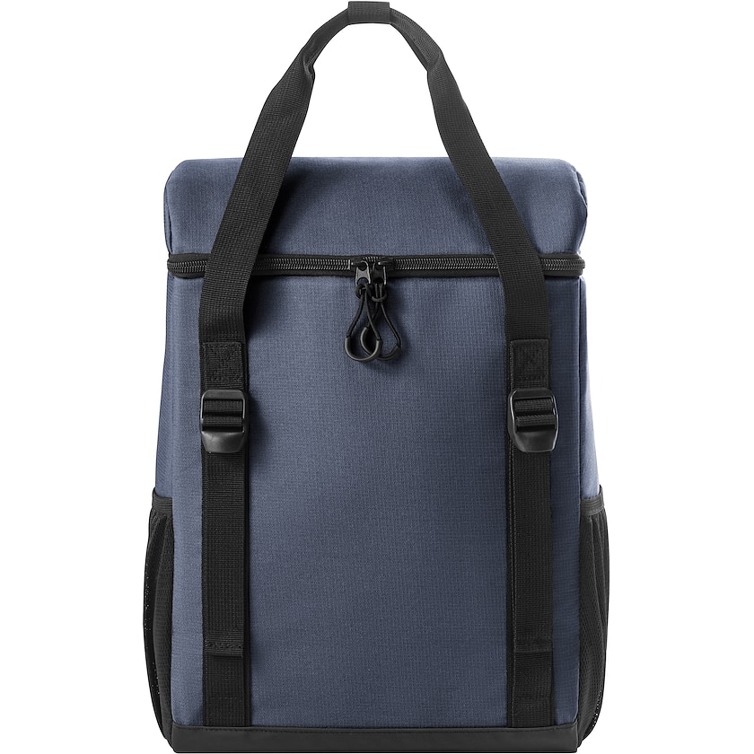 Umweltfreundliche Kühltasche im Rucksackmodell. An den Seiten befinden sich Netztaschen. Fasst 16 Liter. Der Stoff besteht aus rPET, also recycelten PET-Flaschen.