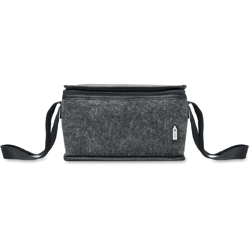 Kühltasche aus recyceltem Filzmaterial. Auf der Vorderseite befindet sich eine Tasche für kleinere Gegenstände.