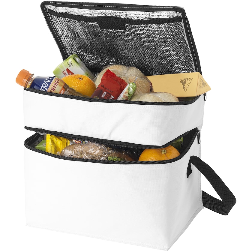 Praktische Kühltasche mit Trageriemen und 2 geräumigen Fächern. Das obere Fach ist perfekt für kleinere Snacks und andere gekühlte Artikel, während das untere Fach ideal für größere gekühlte Artikel ist. Der Trageriemen ist verstellbar.