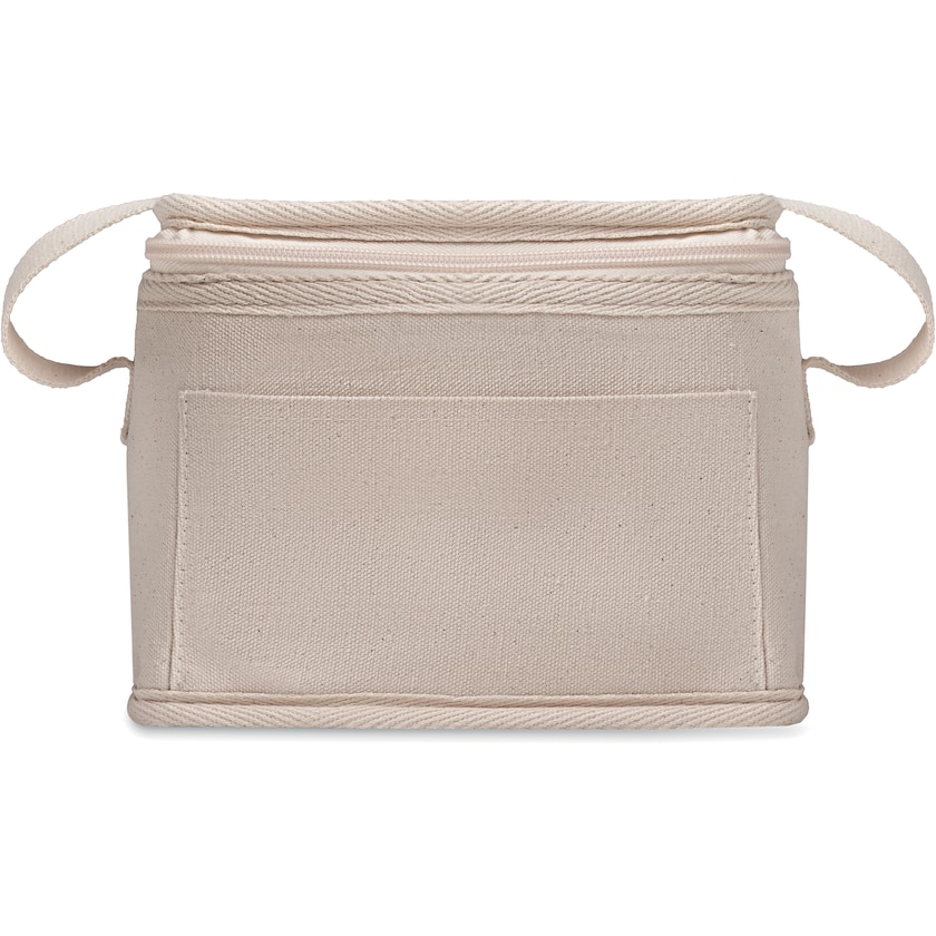 Kühltasche aus krüftigem, naturfarbenen Baumwollstoff. An der Vorderseite befindet sich eine kleine Aufbewahrungstasche.