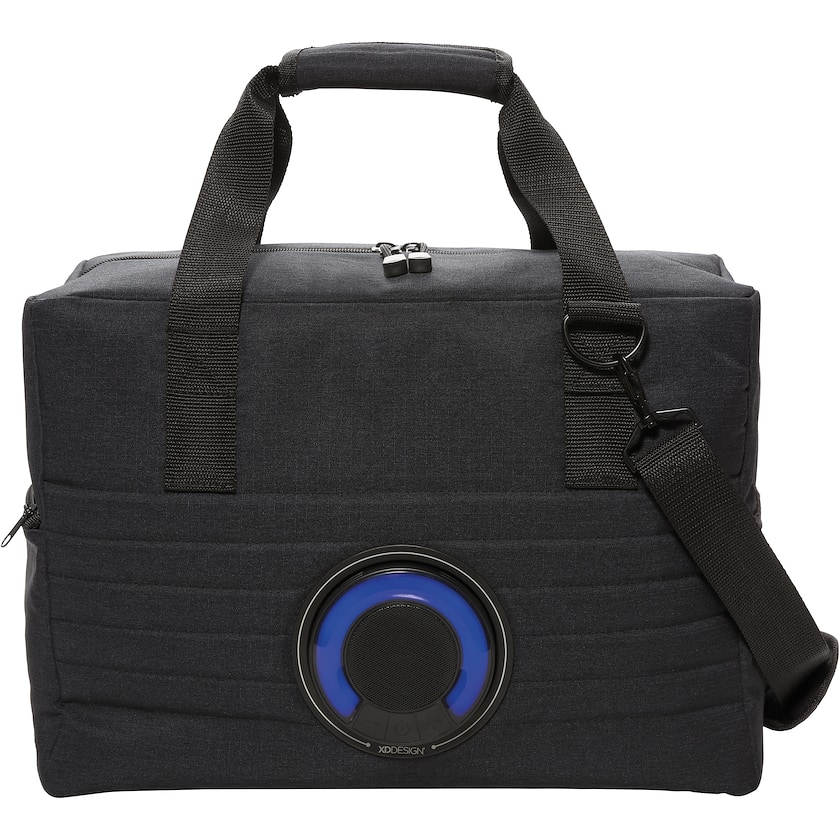 Geräumige Kühltasche mit kabellosem Lautsprecher, der abnehmbar ist, Die Kühltaschebietet Platz für 32 Getränkedosen und hat einen Schulterriemen. Der Lautsprechen hat eine Spielzeit von bis zu 5 Stunden und LED-Lichter, die die Farbe wechsel. Registriertes Design®.
