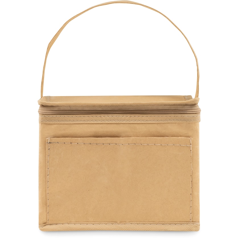 Trendige Kühltasche aus gewebtem Papier. Vorne befindet sich ein zusätzliches Fach. Die Tasche bietet Platz für 6 Getränkedosen.