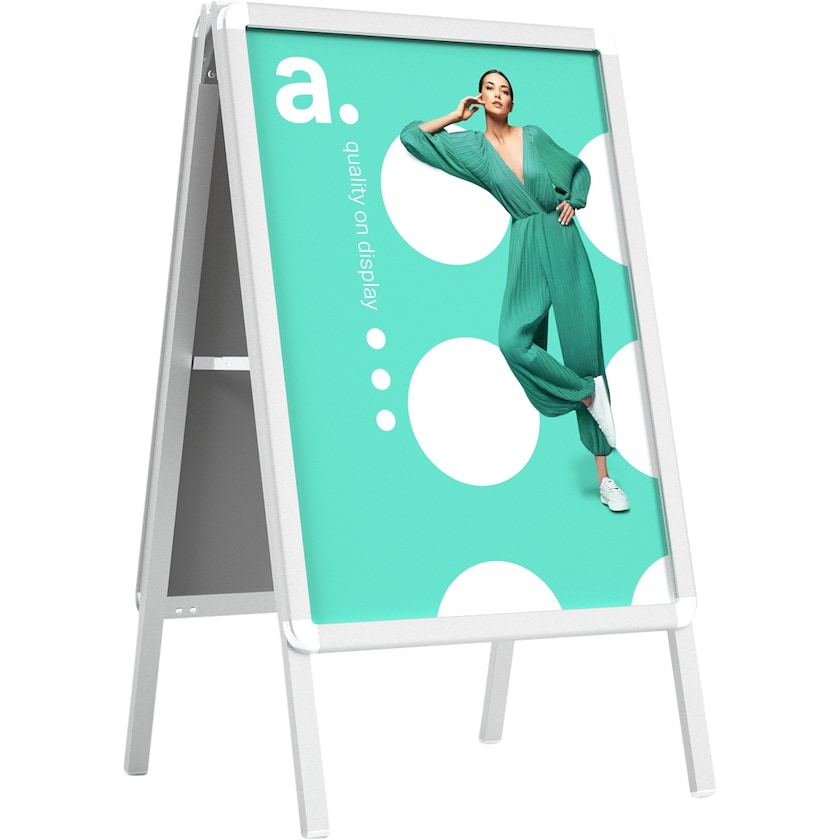 Eloxierte Aluminium-Werbetafel Die Next 50 nutzt die Open-In-Open-Zip-Technologie zum Wechseln der Motive. Dadurch lässt sich der Plakatständer leicht öffnen und das Motiv einfach wechseln. Der Aufdruck ist durch eine nicht reflektierende Folie geschützt, die eine perfekte Sichtbarkeit des Motivs gewährleistet.