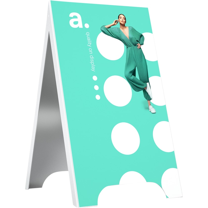 Moderne Werbetafel aus langlebigem Polystyrol. Sowohl die Werbetafel selbst als auch der Aufdruck können jahrelangem Gebrauch standhalten. Der Einsatz im Freien ist kein Problem. Sie ist beidseitig bedruckt und durch Laminierung geschützt.