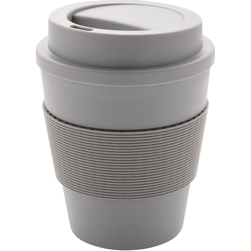 35 cl Take-away-Becher mit verschluss und Grifffläche aus Silikon. Der Becher ist aus Polypropen und kann zu 100 % recycelt werden. Der Becher eignet sich für Mikrowelle und Geschirrspüler.