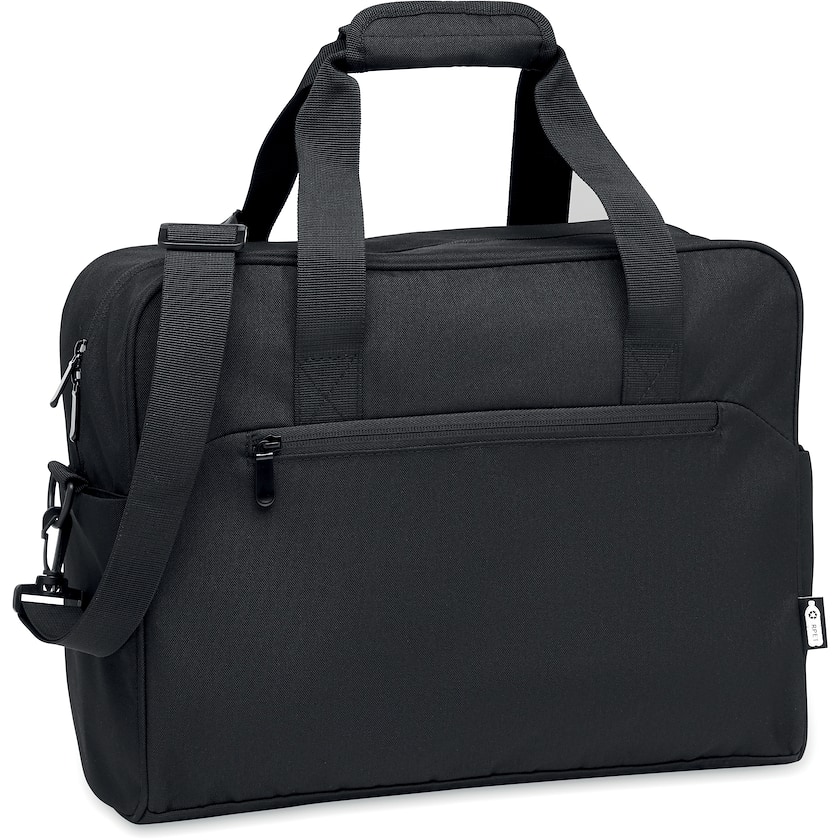 Umweltfreundliche Computertasche für einen 15-Zoll-Laptop. Auf der Vorderseite befindet sich eine Reißverschlusstasche und auf der Rückseite eine Halterung für einen Trolley. Hergestellt aus umweltfreundlichem rPET.