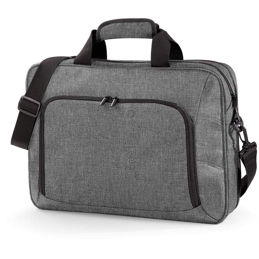 Hochwertige Laptoptasche mit drei Fächern. Die Tasche hat ein wattiertes Fach, das für die meisten Laptops bis 17 Zoll passt. Zusätzlich hat sie ein Fach für ein iPad-mini. Auf der Vorderseite gibt es ein Reißverschlussfach, und auf der Rückseite findet sich eine Befestigungsmöglichkeit für einen Trolley.